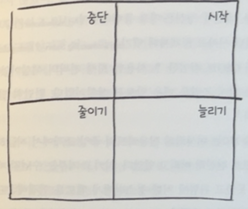 더 적게 필요한 영역과 더 많이 필요한 영역을 구분하는 간단한 도구를 하나 소개한다. 내 친구에게서 배운 방법이다. 그는 이 방법을 워크숍에서 활용했다가 매우 유익하고 열띤 토론을 하게 되었다고 했다. 먼저 화이트보드에 사분면을 그리고 다음과 같이 적는다.